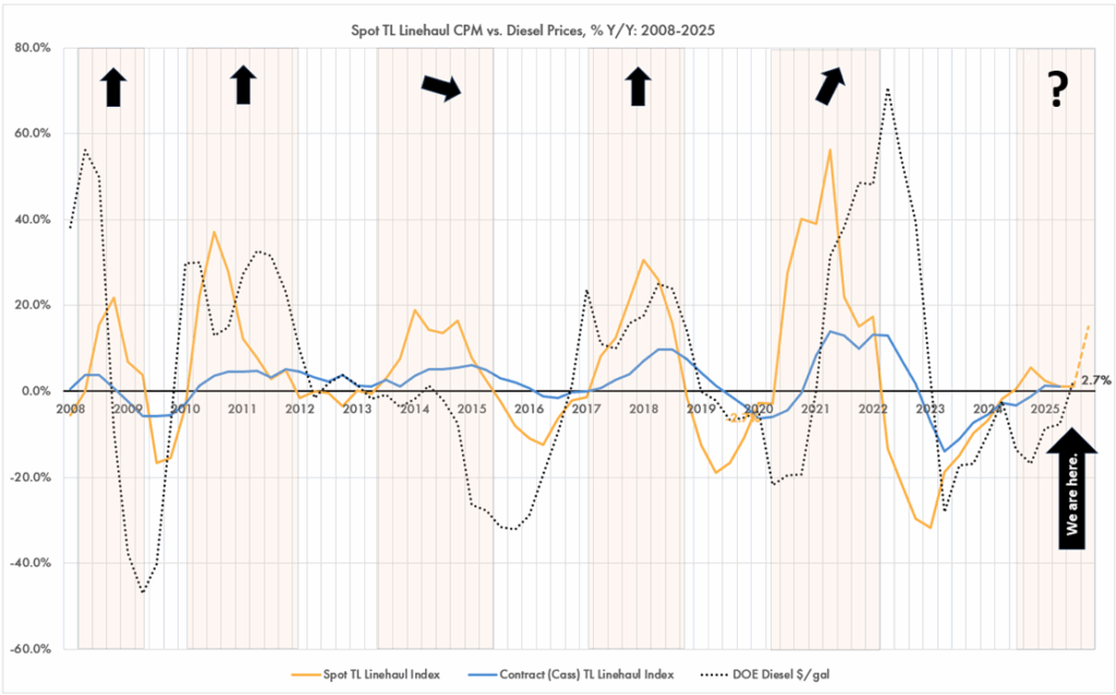 Now with that out of the way and for the readers still with us, we noted in last month’s “there’s a first time for everything” issue that we were in the midst of an unprecedented period (at least for the 20 years that we’ve been paying attention) of apparent Y/Y US truckload market rate equilibrium with both spot and contract indices seemingly stuck at +1-2% for the last two quarters. We attributed the unusual chart patterns at least partially to another unprecedented economic development that continues to disrupt global markets still today: April 2nd Liberation Day and the wildly volatile period of US tariff policy that it ushered in – and we still do. Though as we continue to parse through the last two decades of data that power our models in search of answers, we believe we may have identified a co-conspirator – specifically, US retail diesel prices. To help make our case, we’re featuring the historical relationship between diesel prices at the pump and our spot and contract linehaul rates indices as our Chart of the Month, shown below.