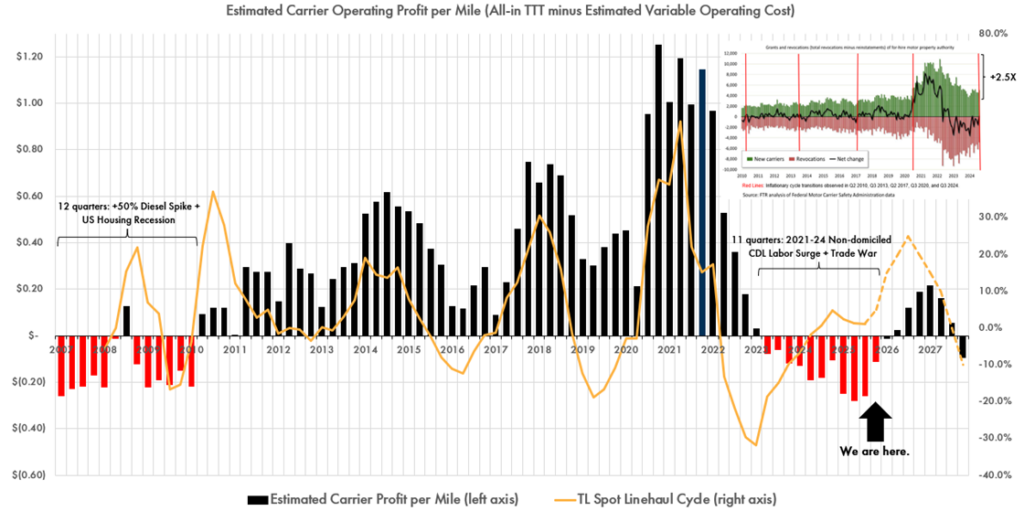 In the chart above, we show the estimated motor carrier operating profit per mile through the US TL Linehaul Spot Rate Cycle going back to 2007. When the bars are in the black, that means that all-in TL spot linehaul rates (including fuel) exceed the average estimated operating cost per mile as reported in ATRI’s annual ‘An Analysis of the Operational Costs of Trucking’ report. And when the bars are in the red, where the market has been going on 11 quarters, those operating costs (which include fuel, driver wages and benefits, lease costs, insurance, tires, tolls, etc.) exceed the national average all-in rate per mile that the spot market is paying.