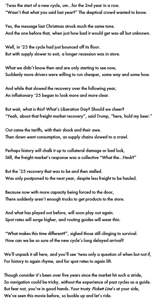In the meantime, the exit rate of surplus capacity has only just accelerated enough to overcome the downdraft in freight volumes to return the rate cycle to its normally scheduled program where history once again continues to rhyme. So here we sit at +2.9% Y/Y for Q4 with most of December still left to go, and once again projecting US spot truckload linehaul rates to surge higher over the year ahead. And now with the stage set for this this special October 2025 holiday issue of The Pickett Line, it’s time for perhaps the most beloved tradition we have here at Pickett Research – then annual holiday poem, inspired by Clement-Clarke Moore’s ‘A Visit from St. Nicholas’: